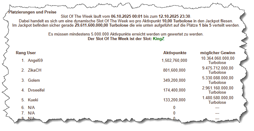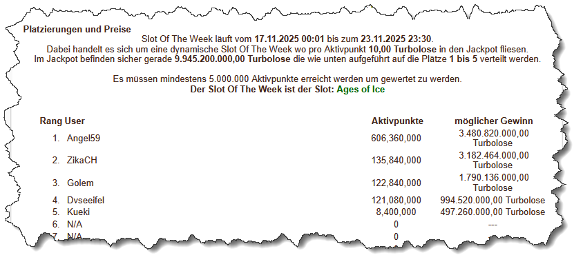 Dabei handelt es sich um eine dynamische Slot Of The Week wo pro Aktivpunkt 10,00 Turbolose in den Jackpot fliesen.