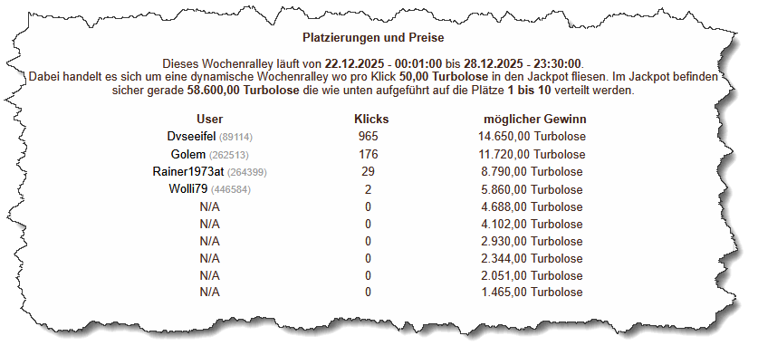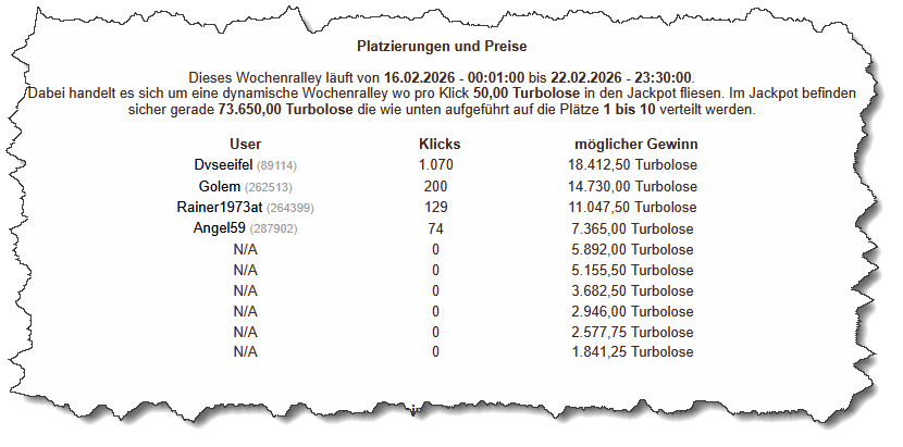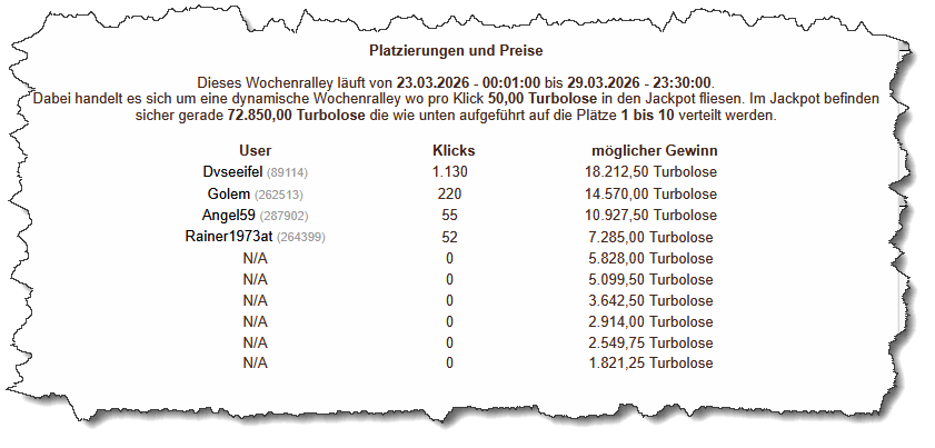 Dabei handelt es sich um eine dynamische Wochenralley wo pro Klick 50,00 Turbolose in den Jackpot fliesen.