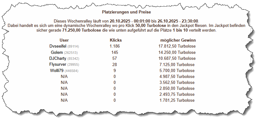 Dieses Wochenralley läuft von 27.10.2025 - 00:01:00 bis 02.11.2025 - 23:30:00.Dabei handelt es sich um eine dynamische Wochenralley wo pro Klick 50,00 Turbolose in den Jackpot fliesen.