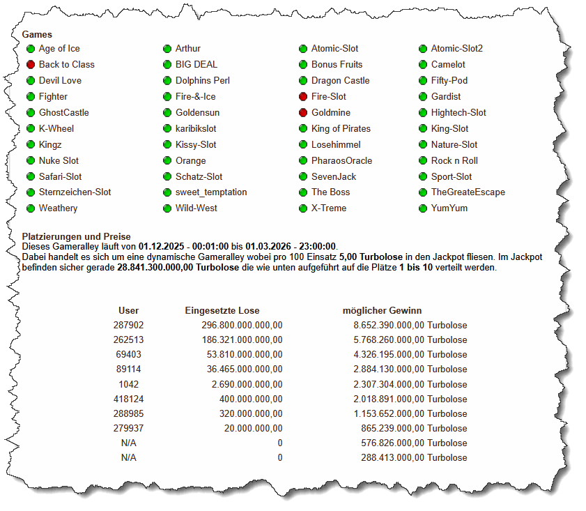 Dabei handelt es sich um eine dynamische Gameralley wobei pro 100 Einsatz 5,00 Turbolose in den Jackpot fliesen.