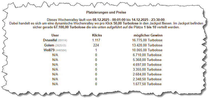 Dabei handelt es sich um eine dynamische Wochenralley wo pro Klick 50,00 Turbolose in den Jackpot fliesen.